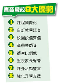少功課多活動雖說直資學校賦予家長有權參與校政,甚至可被推選為校董,但部分傳統名校因校譽關係,本身已享有超然地位,加上受到龐大校友網絡的支持,校方傾向維持固有的辦學傳統,家長實際的「話事權」不高。相對下,新辦的直資學校沒有傳統的包袱,無論在發展改革和家長參與度上都顯得較為積極進取。由於直資學校既獲得政府資助,也可收取學費,加上擁有高度自主權,無可否認,它在資源運用上比起一般官立和津貼小學具有彈性。綜合教育界的意見,直資學校具備八大優勢:課程國際化、自訂教學語言、校園設備齊備、高學歷師資、師生比例低、重視家長聲音、課外活動豐富、強化升學支援。不過在一輪殺校風潮後,現存不少官津小學都自強不息,調配資源推行小班教學及採用活動教學模式,為學生度身訂造教材,故直資學校的優勢已非獨有。