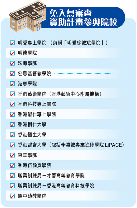 017/18學年起,政府公佈向考獲「3322」DSE成績並修讀自資學士學位學生,提供每年3萬元免入息審查資助,當中涵蓋本港15間專上院校全日制自資學士學位課程,助「自資」學位成「部分資助」。今年,免入息審查資助計畫(NMTSS)的資助額增至33,200元,同時進一步涵蓋16所院校的自資課程。